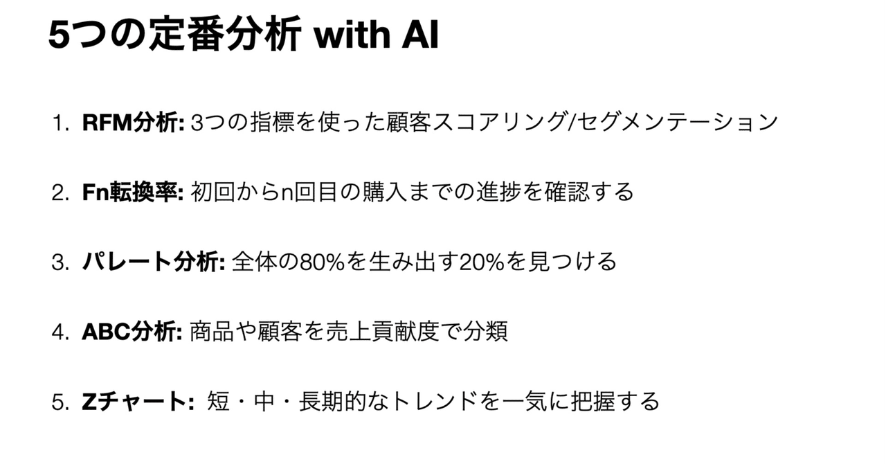 例えば、RFM分析、F2転換率、パレート分析、ABC分析、Zチャートといった分析は、データを少し整えるだけで実行できる王道の分析です。