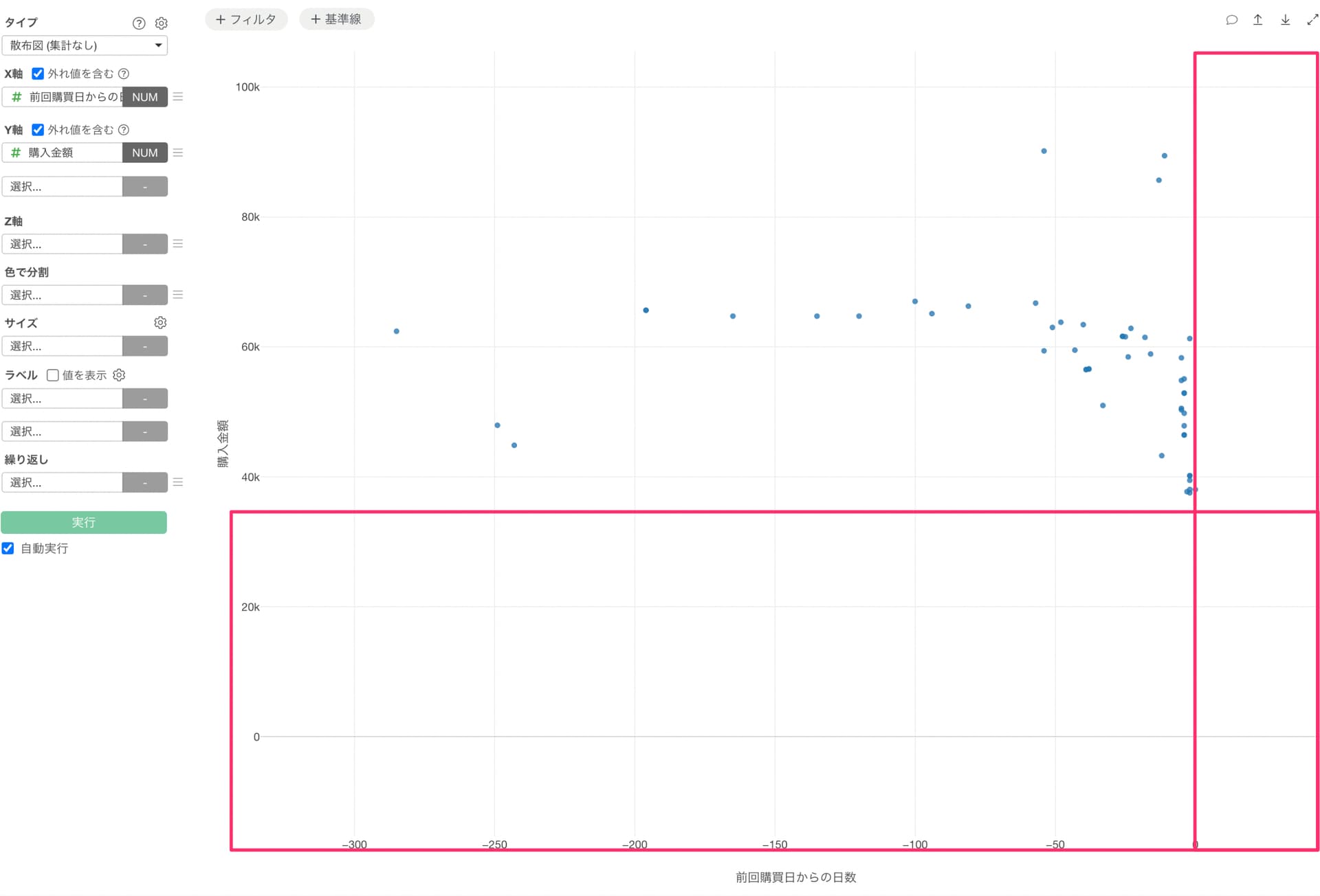 散布図で可視化をしている際に、以下のように余白ができてしまっている場合、設定側で変更が可能です。
