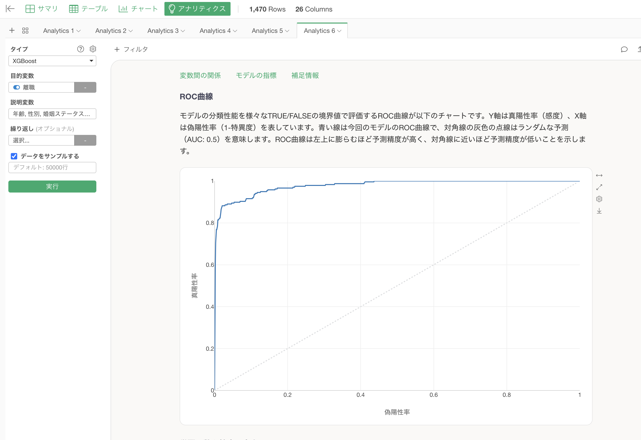 アナリティクスビューにて、XGBoostでロジカル型の列を対象に実行した際には、ROC曲線が表示されるようになっております。