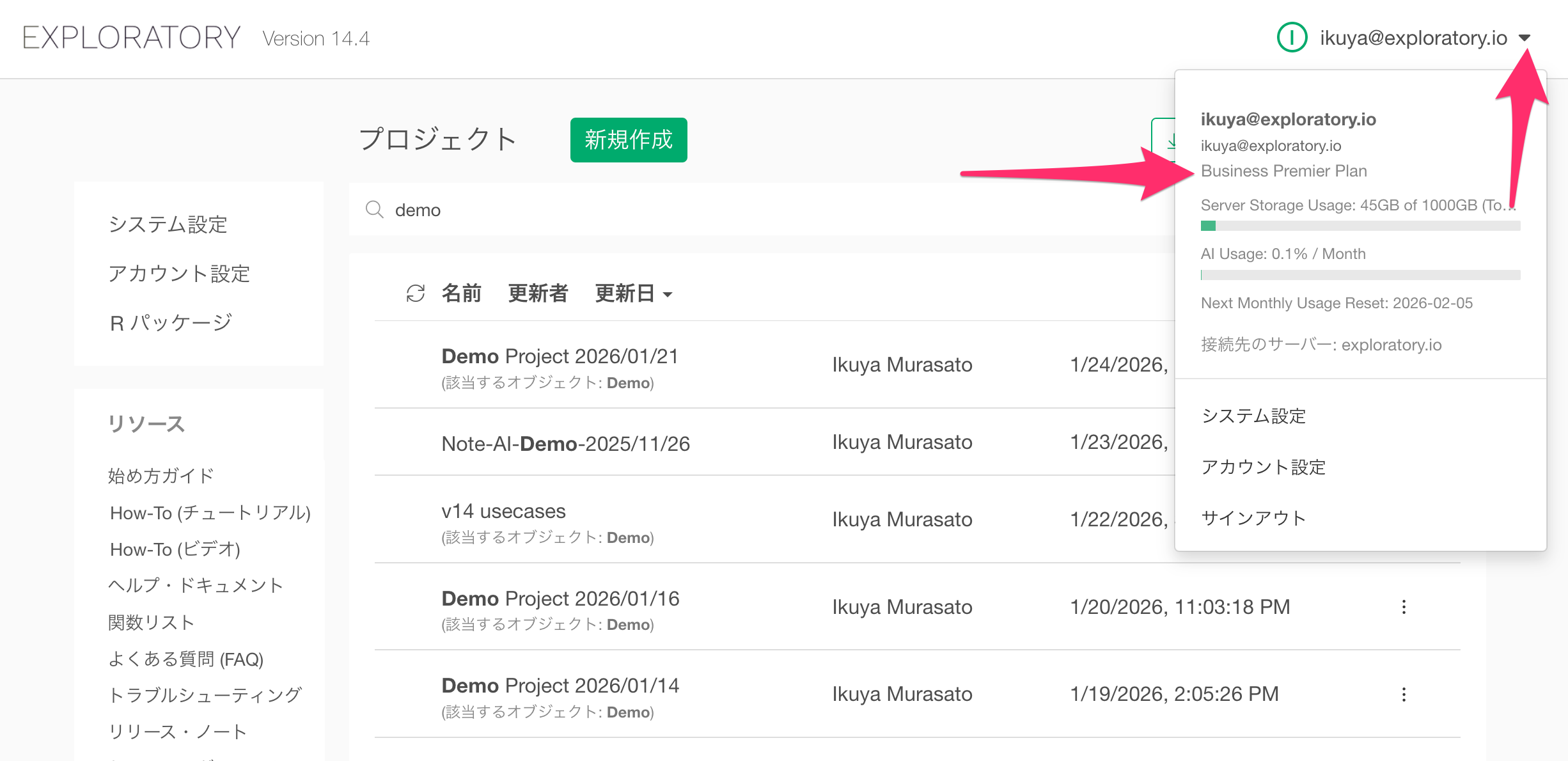 なお、 Exploratoryのプロジェクトの一覧画面の右上に表示されている、お名前あるいはメールアドレスをクリックすることでも現在のプランは確認いただけます。