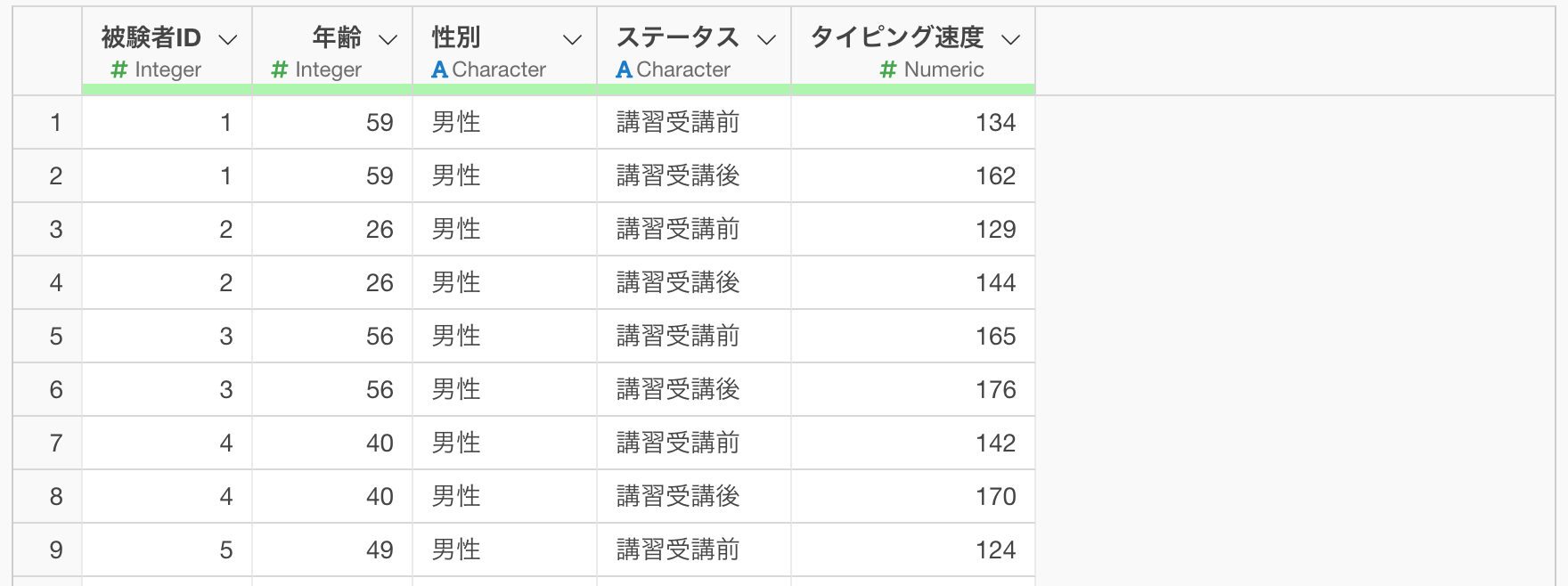 例えば、上記の例では、1行が1人のタイピング速度の計測値を表し、ステータスの列が講習の「受講前」と「受講後」のいずれかを表しています。