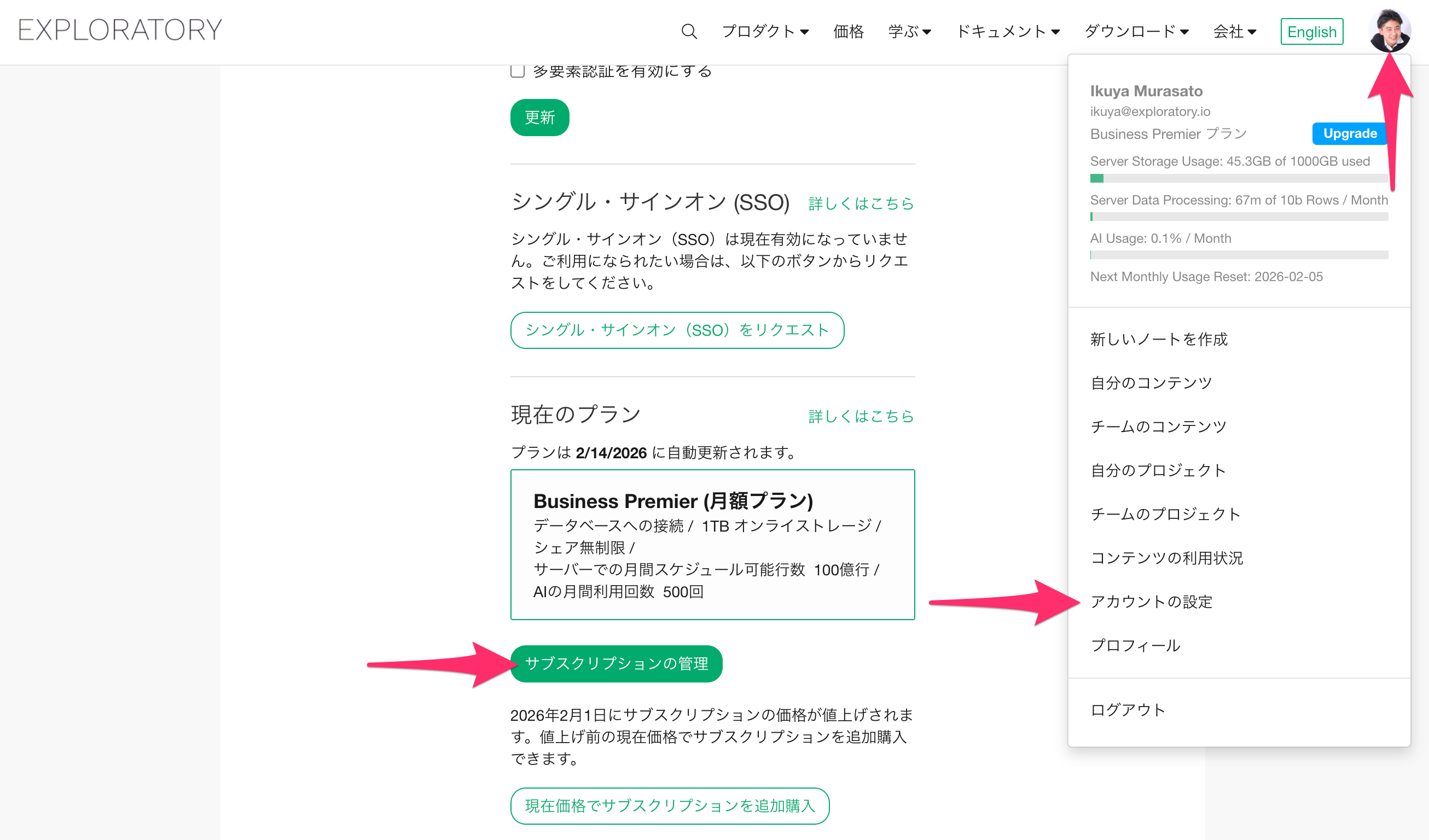Exploratoryではウェブサイトにクレジットカードを登録いただき、自動更新の年額、月額、あるいは年額のサブスクリプションのプランに購読いただくことが可能です。