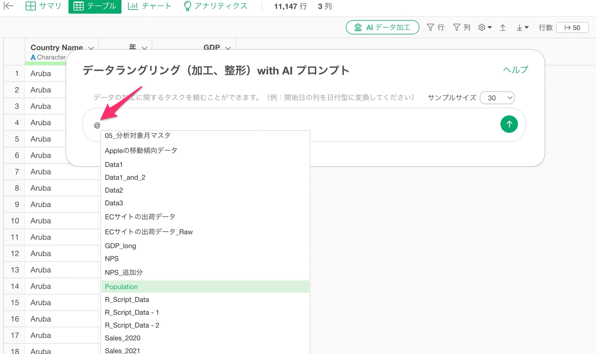 そのため、「@」を入力してデータフレームを参照するようにしてください。