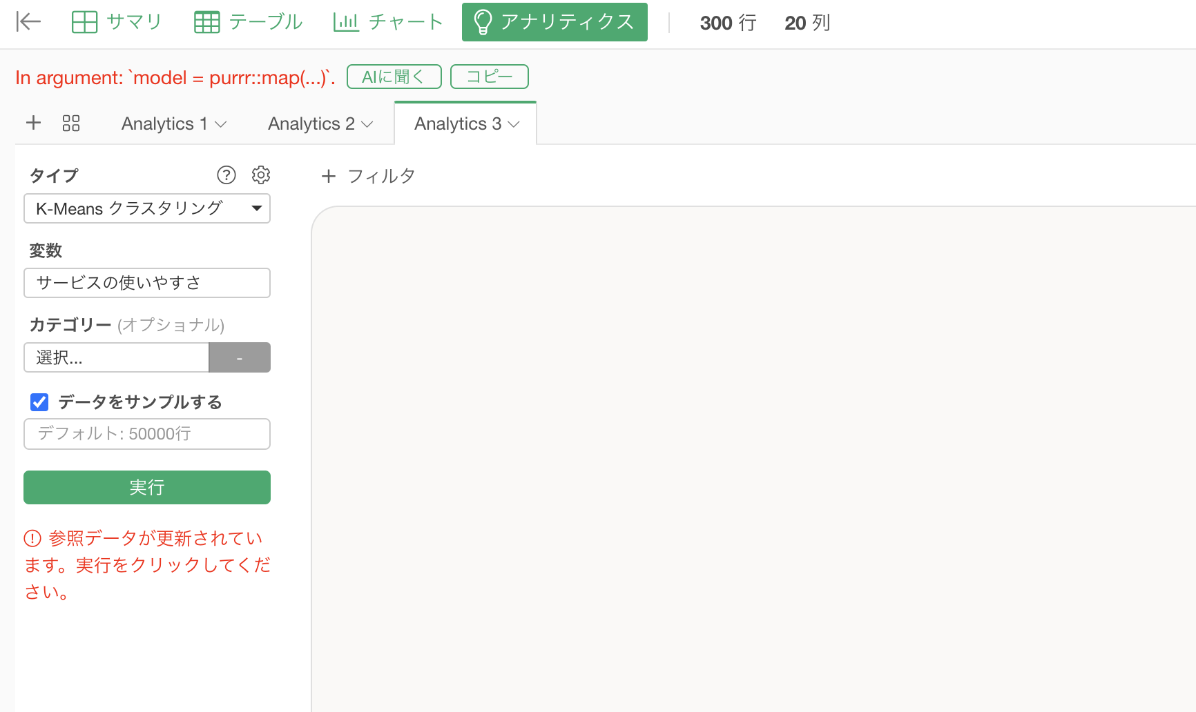 K-Meansクラスタリングにて、サービスの使いやすさなどの5段階評価の1列だけを割り当てて実行した時に、purrr::mapのエラーが発生することがあります。