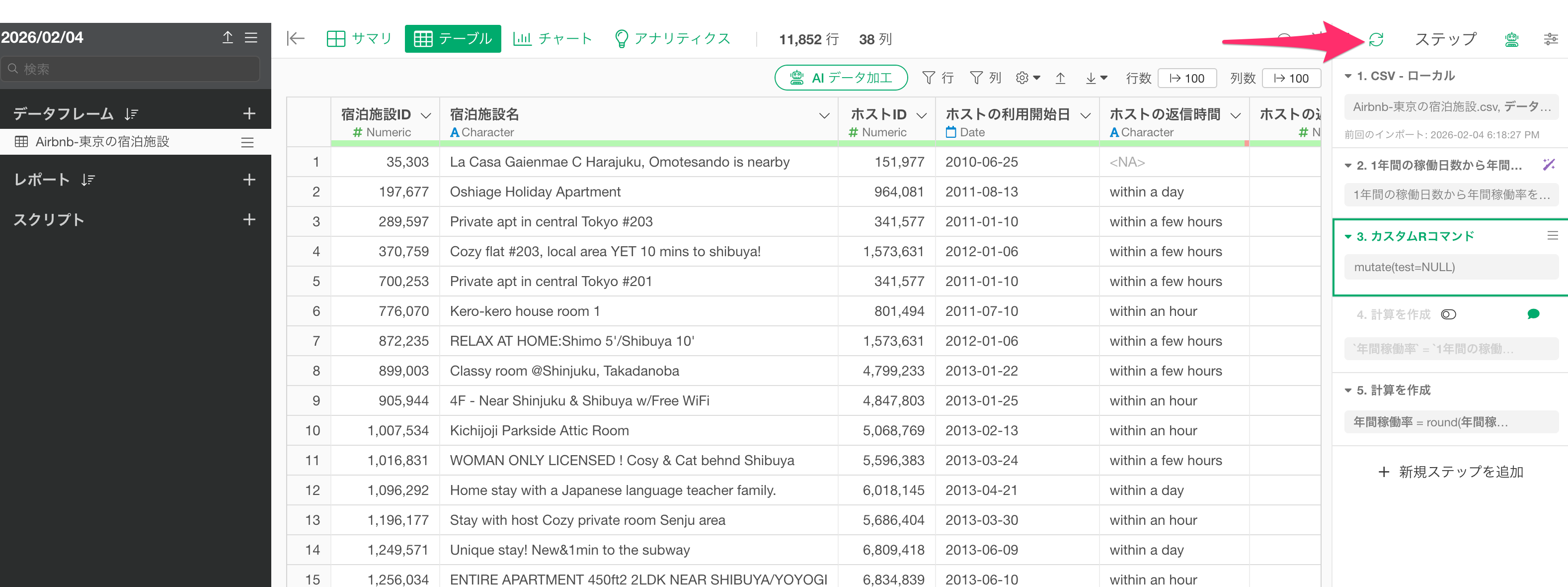 具体的には、データを更新したい、データフレームのステップ上部にある「データの再インポート」ボタンをクリックします。