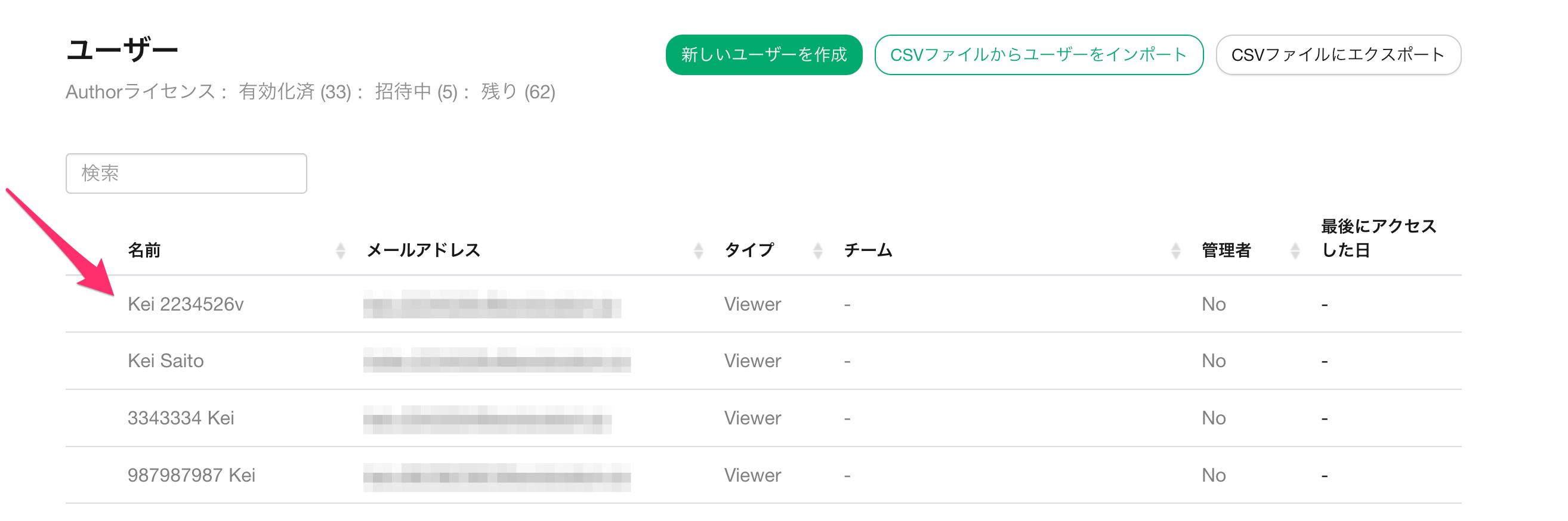 なお、対象のユーザーにアカウント有効化のメールを再送するには、ユーザー管理画面を右にスクロールいただき、対象のユーザーの行に表示される「メールを送る」ボタンをクリックします。