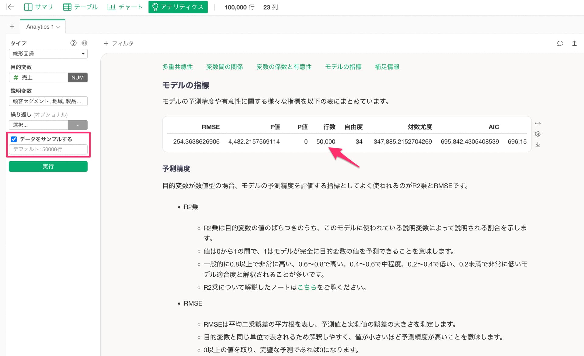また、チェックをつけた状態で行数を変更すれば、サンプルサイズをデフォルトの50,000行から任意の行数に増減できます。
