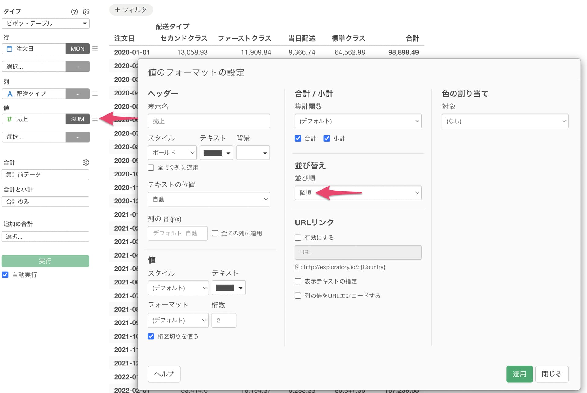 - 値に数値列を割り当てている場合: 列ヘッダメニューから「値の順序をセット」の「別の列の値を元に」を選択し、対象の数値列を指定することで、その数値列の合計値の大きい順に列が並ぶようになります。