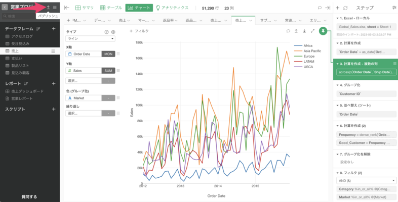プロジェクト全体をExploratoryサーバーにパブリッシュすることで、チーム内で同じプロジェクトをコラボレーションしながら更新しあうことが可能です。データだけでなく、データ加工のステップやチャートなども含めてチーム内で共有・共同編集できます。