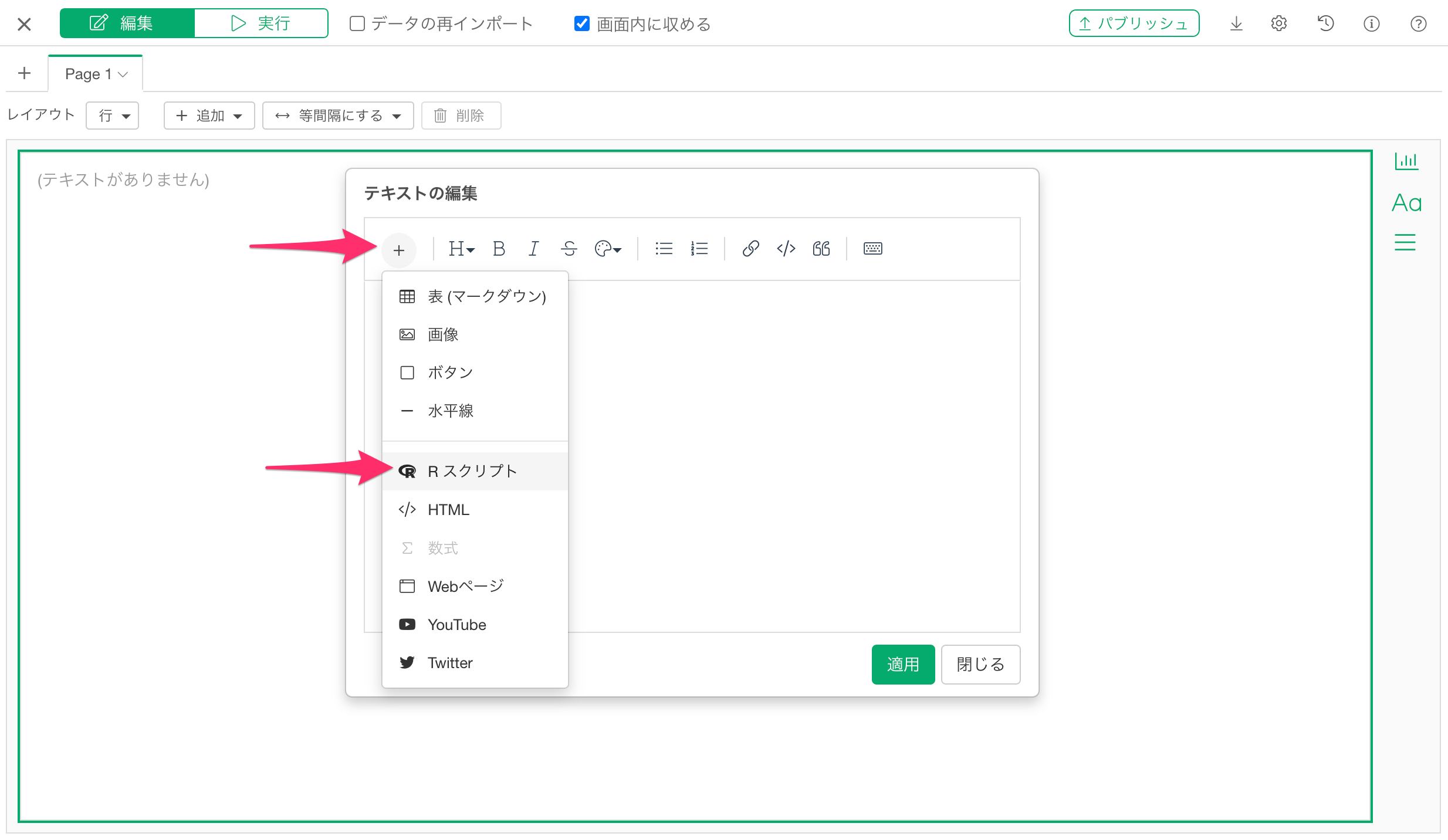 ダッシュボードのテキストパネル内で、Rのコードブロックを挿入のうえ、Rのコードを記述いただくことで、ご自身でインストールしたRのパッケージを使って作成したチャートを含むダッシュボードをパブリッシュ/共有いただくことが可能です。