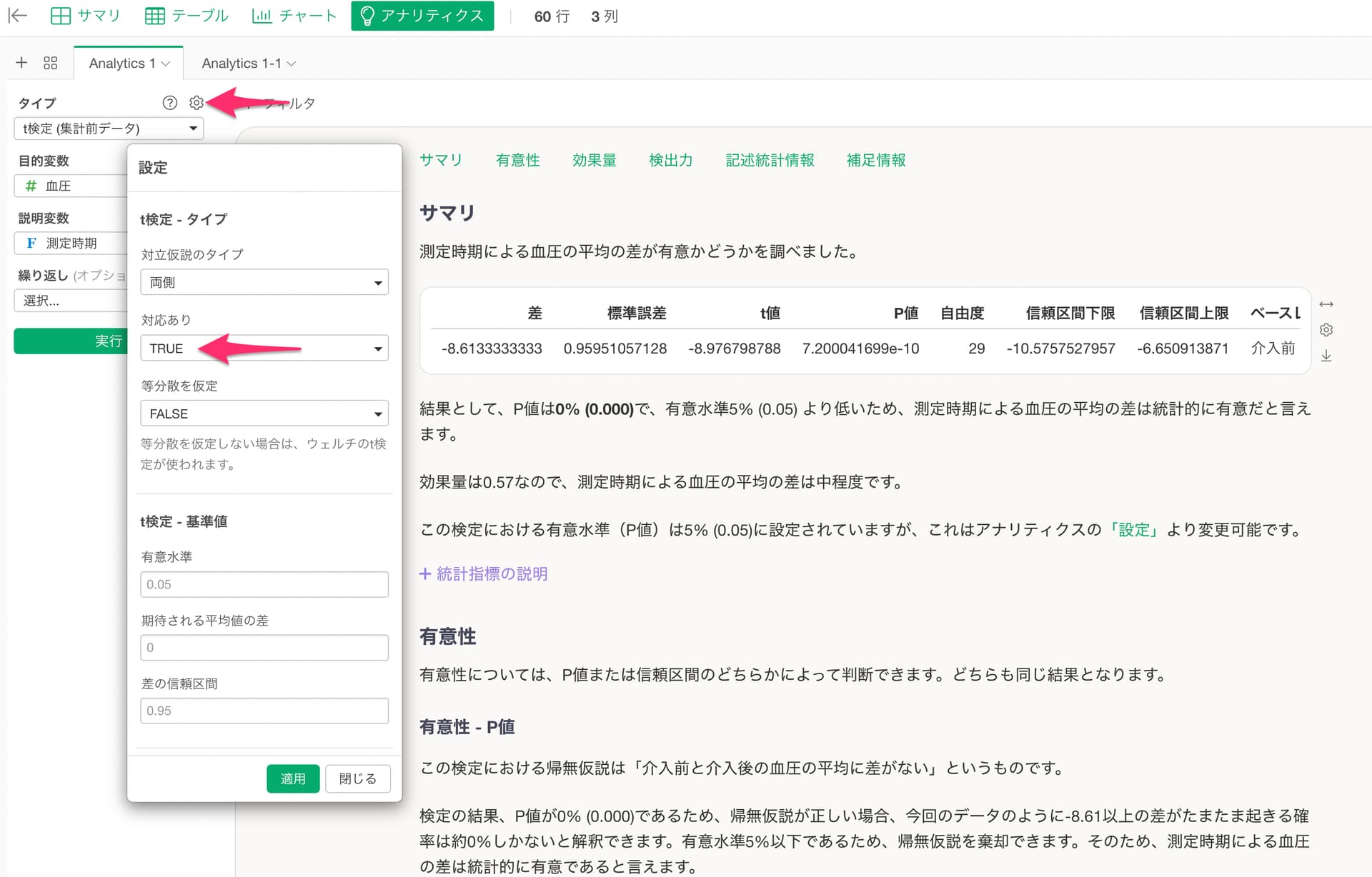 もし対応ありのt検定を行いたい場合は、アナリティクスビューのt検定の設定から「対応あり」の設定をTRUEにすることで可能です。