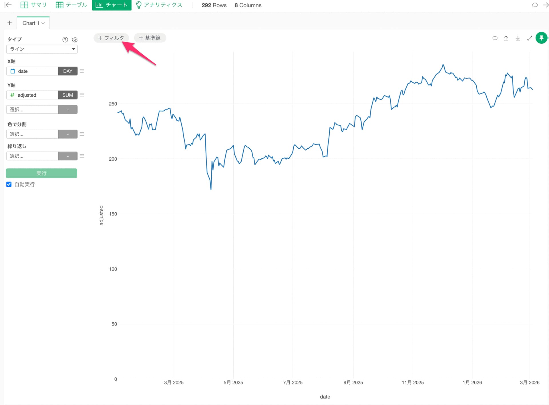 チャート上部の「+ フィルタ」をクリックし、チャートフィルタのダイアログを開きます。