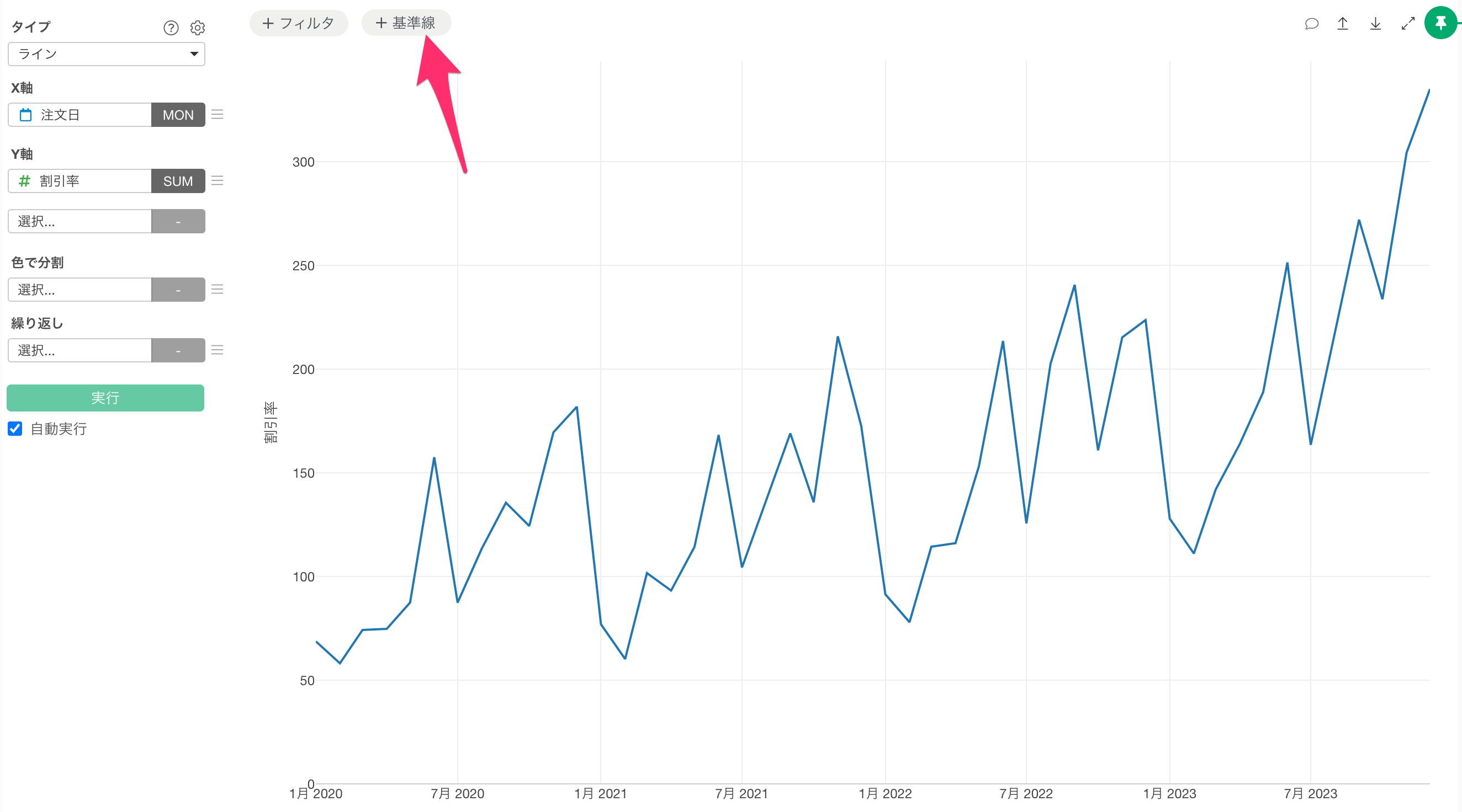 チャートの上部の基準線のボタンをクリックすることで、チャートに基準線(リファレンスライン)を追加することが可能です。
