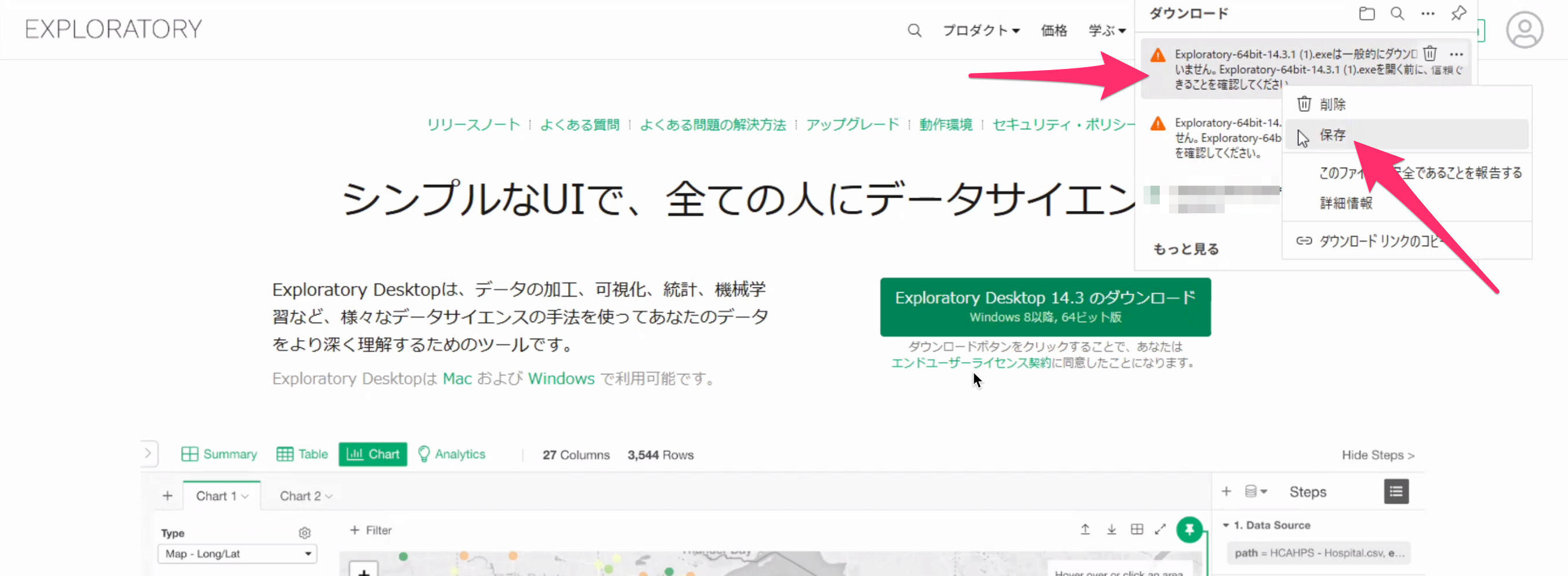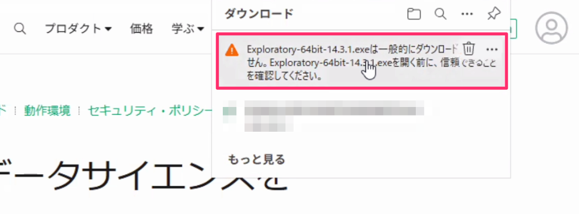 WindowsのEdgeブラウザからExploratoryデスクトップをダウンロードしようとすると以下のような警告が表示されることがあります。